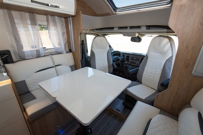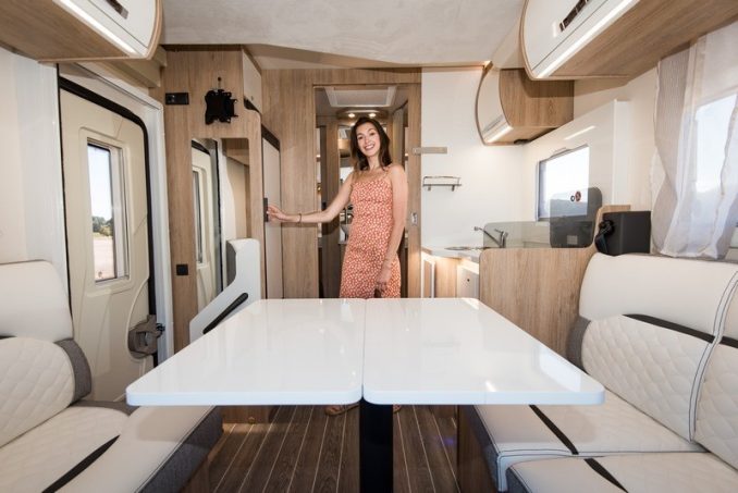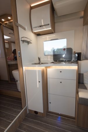 En dînette, le 66 XT joue la carte de la convivialité avec un beau salon face-face décidément très en vogue dans les cellules. Cette vaste dînette, accueillant en son milieu une table à pied excentré et plateau rabattable longitudinalement, est complétée par une cuisine en L avec le retour à l’arrière. Le grand frigo prend place à l’opposé, juste à l’aplomb de la grande porte d’entrée.
