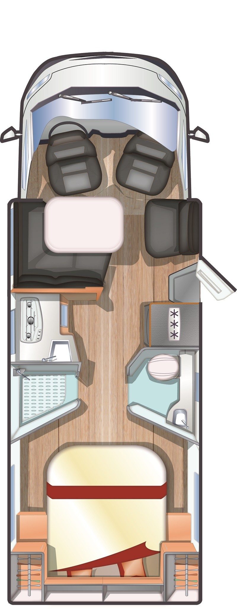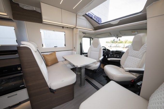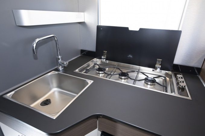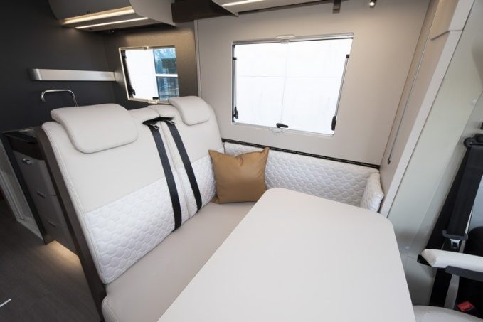 Ce tout nouveau profilé signé Adria impressionne par la qualité de sa réalisation et le soin apporté à sa présentation. Particulièrement en finition Supreme, parée d’une robe gris métallisé, qui implique une carrosserie aluminium (polyester sur les Plus, blancs). Sur cette implantation SC, nous avons affaire à une dînette classique avec banquette face route et retour, peut-être un peu moins conviviale qu’un salon face-face, mais qui conserve ses adeptes et évite les manipulations pour mettre en œuvre les sièges "route" (même si, chez Adria, la manœuvre a été revue et se fait en un tournemain). L’ensemble se complète d’une cuisine inédite en L, avec un large réchaud trois feux et un ensemble évier/mitigeur plutôt pratique et esthétique. Le plan de travail est un peu chiche, mais le matériau dans lequel il est réalisé se révèle très agréable au toucher et à la vue. Signalons, pour les amateurs de café, l’option permettant de disposer, contre la paroi de la salle de bains, d’une machine à expresso (199 €). Bel ensemble, enfin, au niveau du retour du dossier de banquette, aminci, avec de jolies courbes.