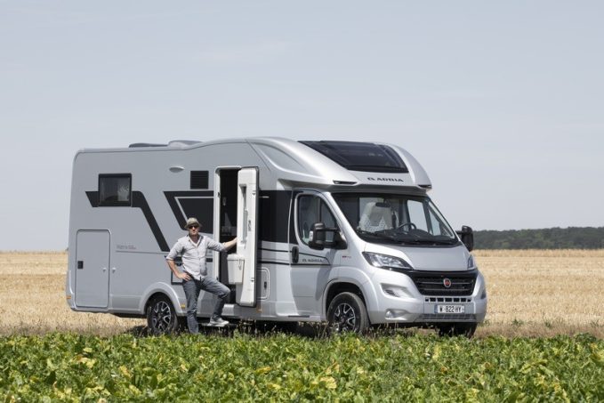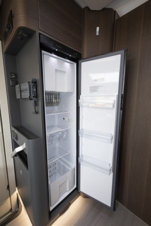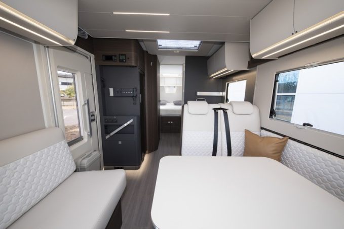Belle ambiance en chambre également, où trône un lit central réglable en hauteur électriquement depuis la soute, grâce à un interrupteur. La tête est relevable (manuellement) afin de faciliter le passage en pied, où l’on trouve un petit placard. Même matelas complément déployé, l’accès de chaque côté reste possible. La salle d’eau se répartit de part et d’autre de la cellule, dont la douche côté conducteur. L’ensemble est bien évidemment cloisonnable côté chambre et partie jour. Mention particulière pour le lit de pavillon, très bien intégré une fois calé contre le plafond.