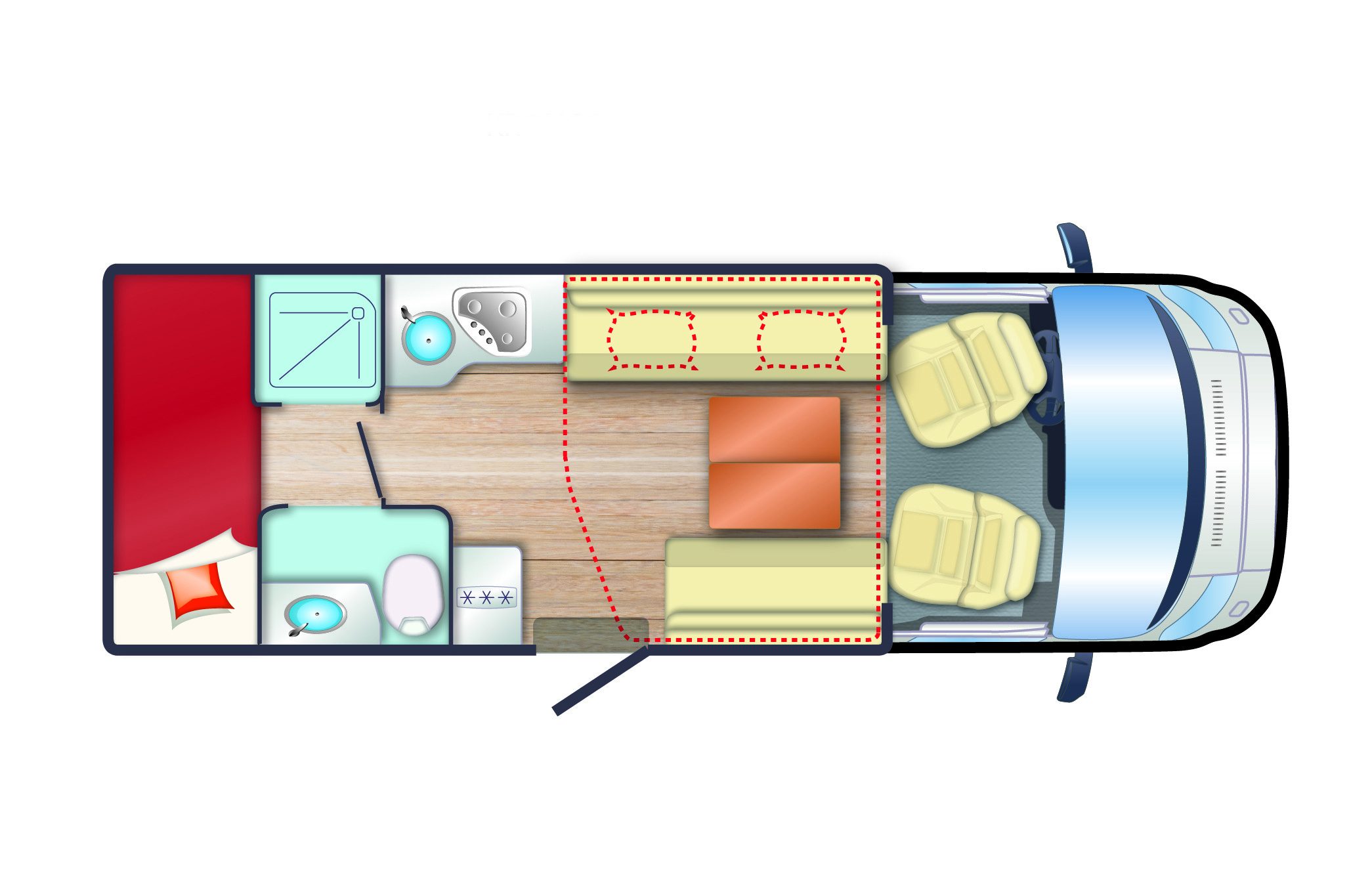 Le 234 TL ne dispose pas de lit permanent. Un couchage de pavillon électrique de grande taille (160 x 190 cm) représente le couchage principal tandis qu’un lit d’appoint, escamotable et amovible, prend place dans la soute. Il peut sans problème accueillir un adulte avec sa longueur de 210 cm pour une largeur de 70. Enfin, la dînette transformable peut accueillir un quatrième dormeur. La salle d’eau dispose ses postes de part et d’autre de la cellule : douche à gauche et cabinet de toilette à droite. L’ensemble peut bien sûr être réuni et isolé de la partie jour.