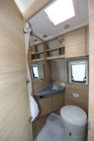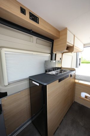 Le bloc-cuisine intègre un nouveau réfrigérateur Dometic de 90 l plutôt astucieux, avec sa porte s’ouvrant dans les deux sens pour y accéder de l’intérieur et de l’extérieur. Pas très grande, la salle d’eau dispose d’un simple rideau en Nylon pour éviter les projections d’eau en utilisant la douche. Pour 3 500 € de plus, les packs Châssis et Confort se révèlent quasi obligatoires pour parfaire le bien-être à bord et bénéficier de la climatisation manuelle en cabine, d’une moustiquaire de porte latérale, d’un marchepied électrique.