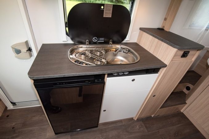 • Carrosserie en polyester (toit) et alu (parois), panneaux sandwich à ossature bois • Eau propre/usées : 20(116)/92 l • Gaz : 2 x 13 kg • Réchaud 2 feux • Réfrigérateur 90 l • Chauffage/chauffe-eau Truma C4