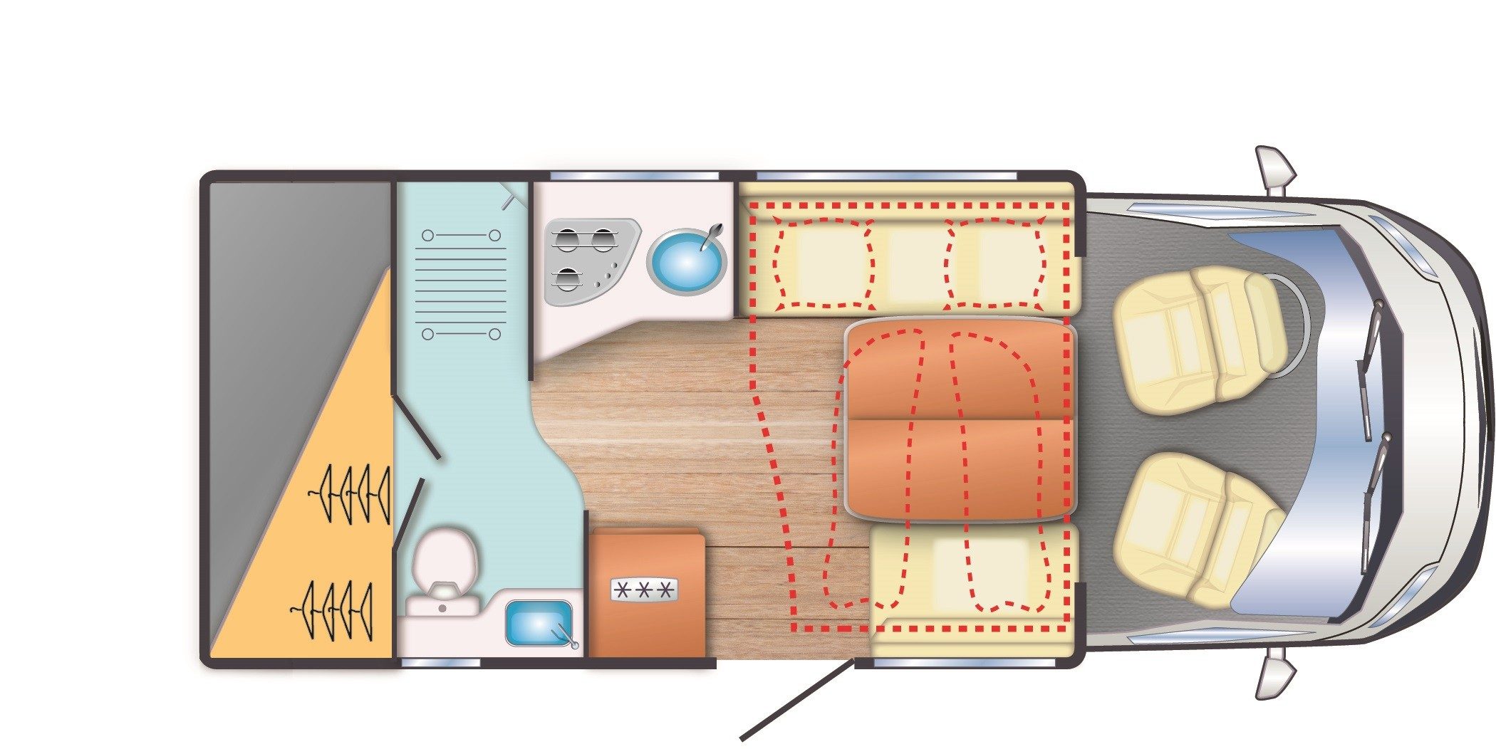 Le nouveau profilé MC4 237 s’étire sur 6,36 mètres. Une compacité permise par l’absence de lit permanent, même de pavillon. Et c’est là que les limites de l’exercice se font sentir, car transformer la dînette tous les soirs n’est pas une sinécure. Si la manipulation en elle-même ne présente pas de difficulté particulière, elle n’en reste pas moins contraignante et le confort limité. L’option lit de pavillon électrique (1 000 €) semble indispensable. Certes, ses dimensions sont moins généreuses (133 x 190 cm), mais le confort apporté par son véritable matelas en mousse est sans commune mesure.