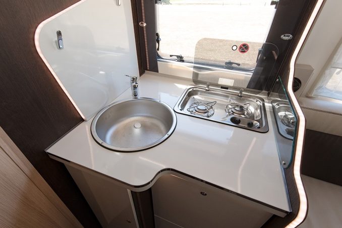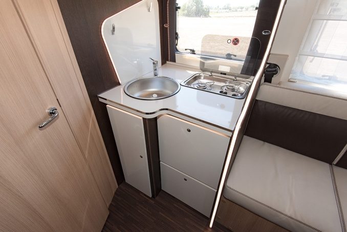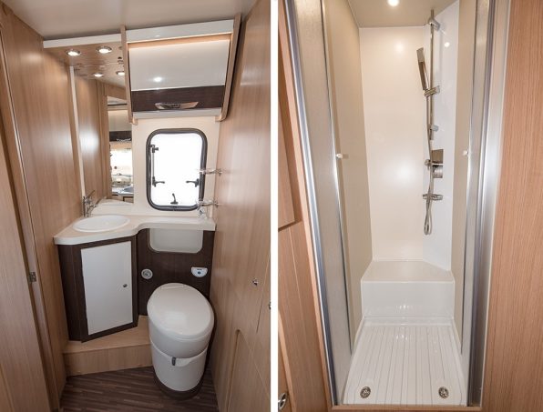 Reste que ce 237 mérite le détour. En premier lieu pour son salon face-face, bien dans l’air du temps et agréable, même si la manipulation de la table, avec une double cinématique, déroute. En revanche, l’installation des places route se montre relativement simple. Le coin cuisine n’est pas très grand, mais bien pensé. Le réfrigérateur trimixte annonce une contenance de 142 litres. La partie arrière comprend une belle salle d’eau et un vaste dressing surplombant la soute. L’espace toilette offre un espace généreux avec vasque d’angle/bloc WC à droite et douche à gauche. Cette dernière est fermée par une paroi translucide rigide. Dommage que le passage de roue empiète dans le fond du bac. Tout en fond de cellule, le dressing s’étale sur deux tiers de la largeur, laissant derrière la douche un espace en soute dévolu aux grands objets (skis, auvent…) et atteignable par un portillon haut côté gauche, un plus petit se trouvant à droite.