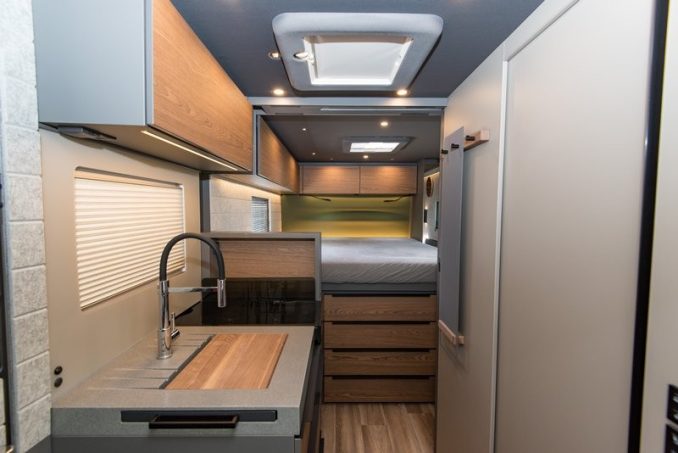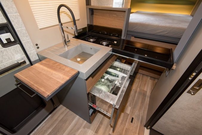 Pour ne pas rater son lancement, Niesmann+Bischoff a décidé d’afficher une prestation haut de gamme. On retrouve donc dans la configuration de base un certain nombre d’équipements tels que les jantes 16 pouces avec des pneumatiques M+S, le pack Châssis (climatisation auto, suspension confort sur l’essieu avant…), le pack Confort (lanterneau panoramique, feutrine sur les parois, éclairage intuitif avec capteurs de mouvements, etc.)… Toutefois, ce Liner propose également une longue liste d’options, à commencer par le pack Espace cuisine Premium qui permet de profiter d’un innovant poste (meuble coulissant, plaque de protection réchaud faisant office de plan de travail) ainsi que d’un grand réfrigérateur de 138 l.