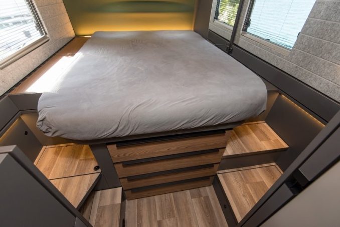 En partie arrière, ce 7.3F ne s’y trompe pas en accueillant un superbe lit central de 2 m de longueur (138 cm de largeur, malheureusement). Il règne une ambiance feutrée dans cette chambre, une véritable invitation à se prélasser sur le sommier et profiter de la lumière et de la vue qu’offrent les deux baies latérales. Malgré l’ouverture sur la zone de vie, Niesmann y répond par un dispositif ingénieux avec une porte coulissante associée au meuble cuisine qui se relève électriquement pour venir compléter ce cloisonnement. Impressionnant et très pratique. En partie avant, le lit de cabine se révèle d’une grande discrétion. En sus d’être assez plat, il profite de coloris qui le confondent presque avec la feutrine grise apposée sur toutes les parois. Le constructeur est tellement fier de l’intégration qu’un brevet a été déposé et attend sa validation. Le lit double de cabine affiche des dimensions de 130 x 190 cm, une largeur un peu décevante.