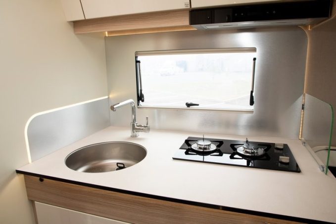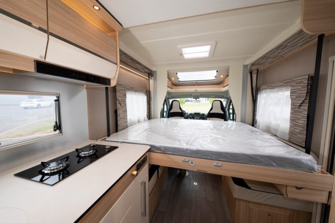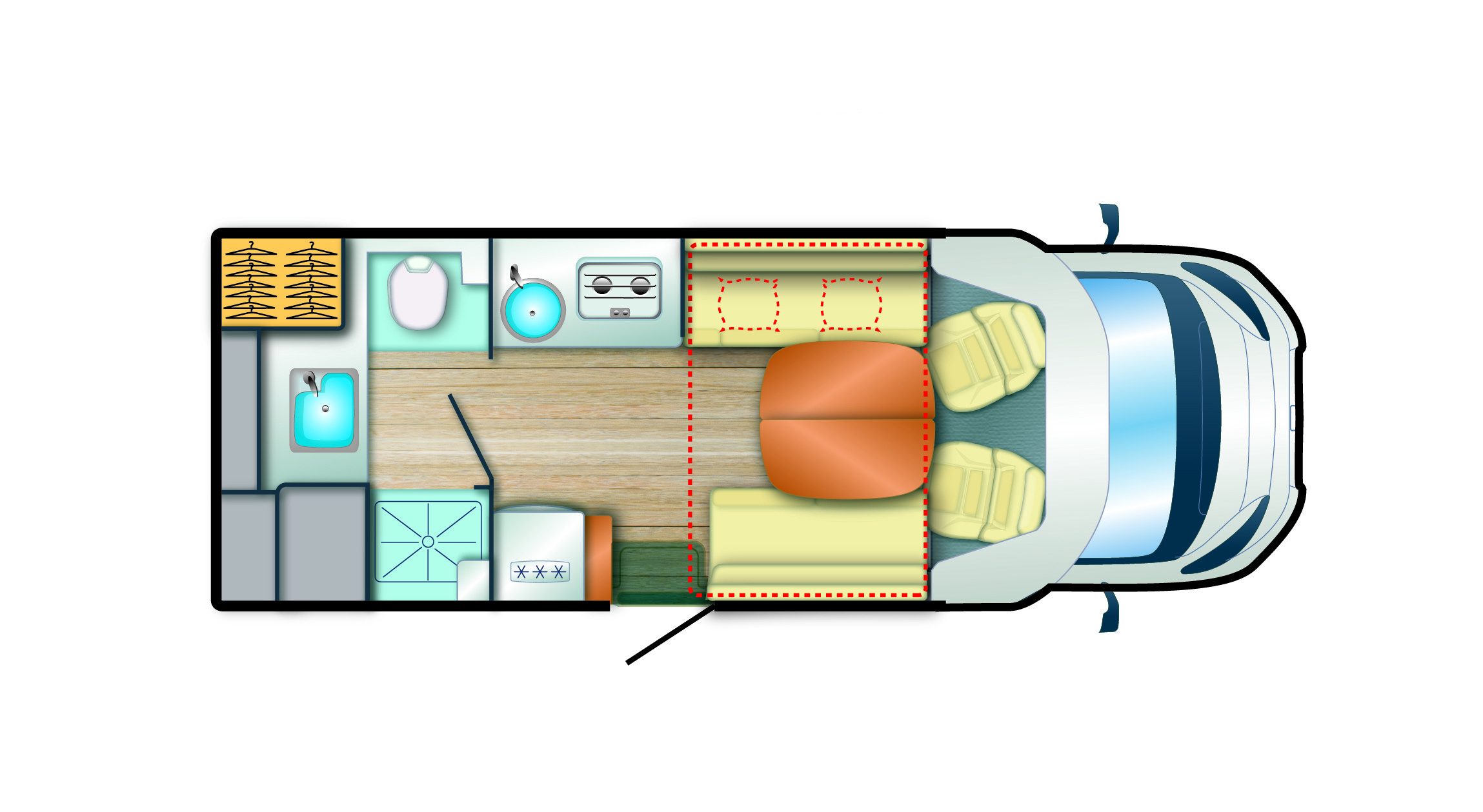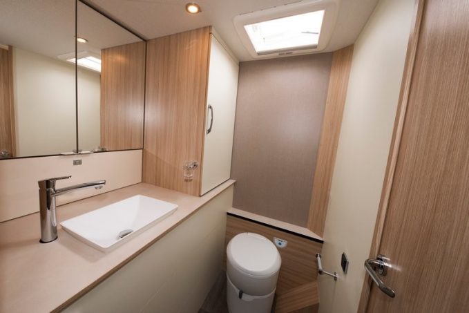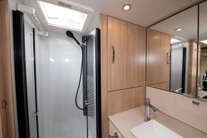 En l’absence de lit permanent au plancher, le fond de la cellule accueille un vaste cabinet de toilette avec un lavabo central entouré de deux grands placards, une douche et un WC, de chaque côté. Le couchage principal est donc le lit de pavillon de 150 cm de large, au-dessus du salon. Sa mise en place est facilitée par une motorisation électrique. S’il peut être descendu jusqu’à 85 cm du sol, il se règle également à mi-hauteur pour pouvoir coucher deux personnes en plus, après transformation du coin dînette en grand lit. Il suffit alors d’abaisser le pied de table puis de poser les coussins des banquettes.