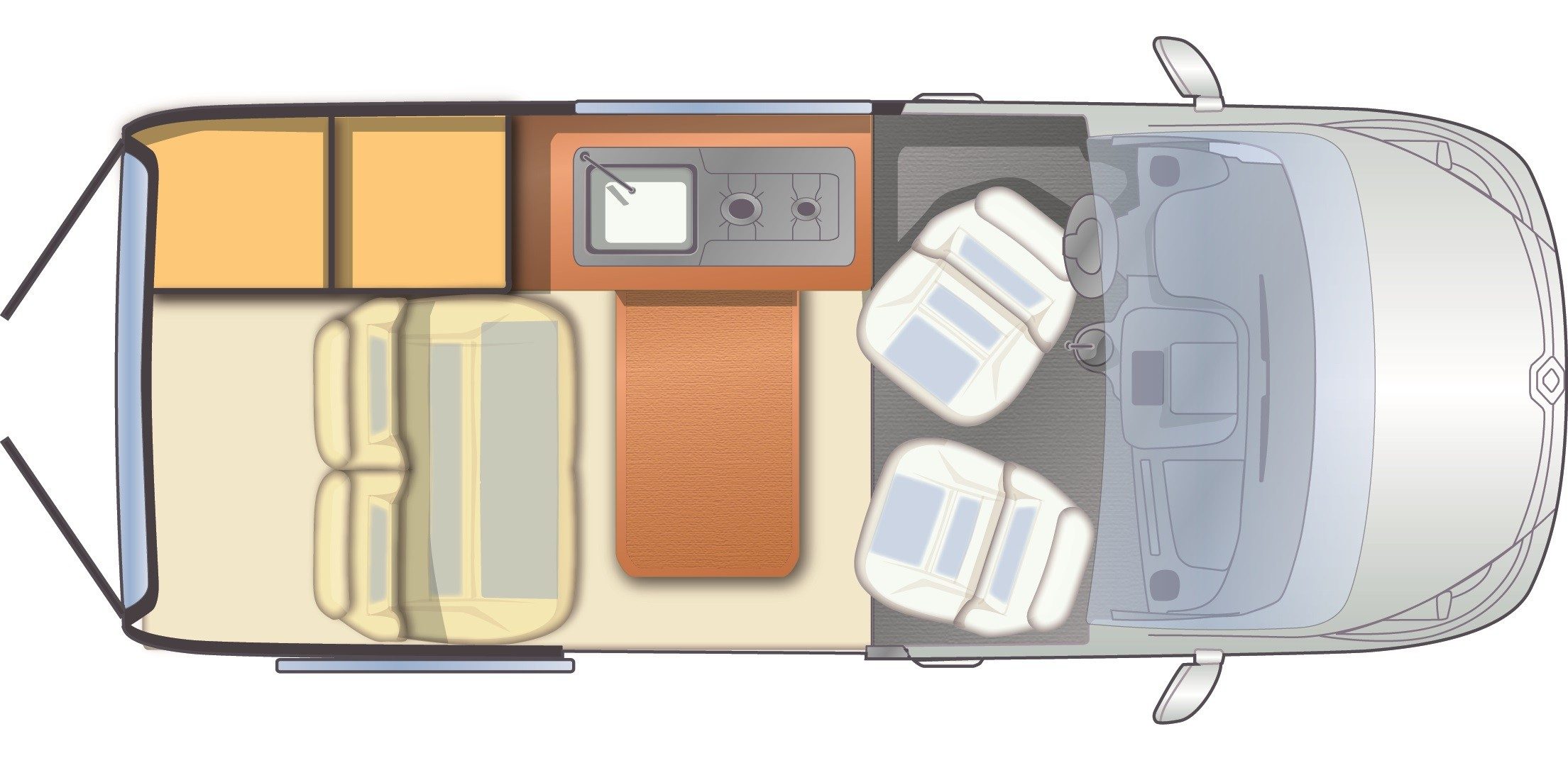 La banquette, fixée sur rails coulissants, peut transporter trois passagers face à la route. Une table amovible, à quatre pieds, autorise les repas à cinq convives quand les sièges cabine sont retournés. En revanche, il n'est possible d'y faire dormir que quatre personnes, après transformation de la banquette en couchage biplace (186 x 114 cm) et en utilisant le lit double, dissimulé dans le pavillon du toit relevable. Un grand placard, prolongement du meuble de cuisine vers l’arrière, intègre pas mal de rangements, dont deux grands tiroirs, toujours utiles.
