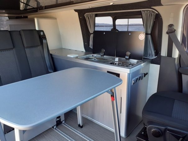 Profitant d’une excellente base avec le Ford Transit Custom, très automobile par son comportement comme pas son silence de fonctionnement, l’Adelaïde bénéficie aussi d’un mobilier très moderne dans sa conception et ses coloris.