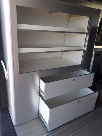 Lando n’utilise pas de bois pour son mobilier. L’aménageur emploie une structure en aluminium alvéolé. Ce matériau léger permet aussi de créer des formes plus galbées pour un rendu proche de réalisations industrielles. Pour l’implantation de l’Adelaïde, Lando s’est inspiré du VW California. On trouve une kitchenette placée sur le flanc gauche. Elle permet d’avoir sous la main évier, réchaud à gaz et réfrigérateur coffre de 40 l.