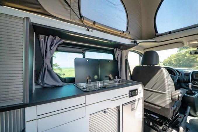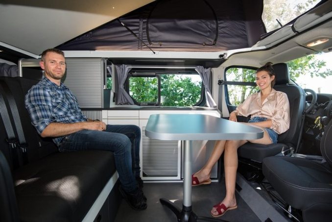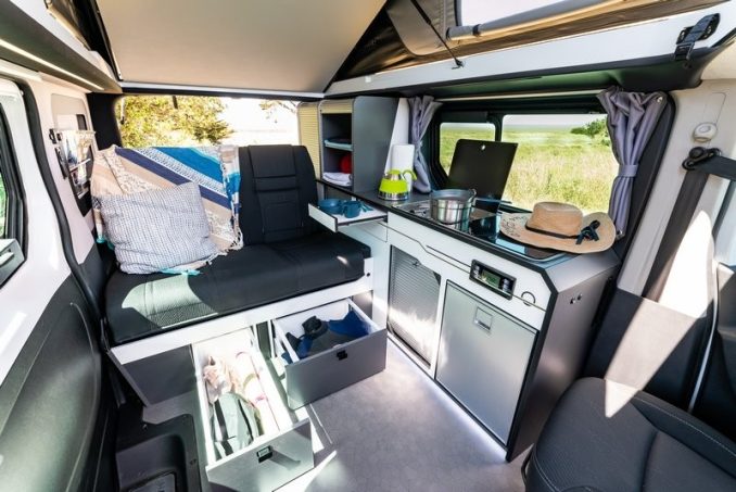 Best-seller de la gamme Hanroad, le Trek 4 méritait bien quelques attentions. C’est chose faite pour cette collection, avec une refonte assez marquée. Même si côté implantation rien ne change, avec un plan classique pour un van de moins de 5 m. Le moins visible, mais pas le moins important, est l’adoption d’un plancher à l’épaisseur quasiment doublée, garant d’une meilleure isolation thermique et acoustique. Le meuble latéral a également été entièrement repensé avec une construction monobloc lui offrant un aspect plus qualitatif, et intégrant des éclairages indirects. La réalisation soignée et le design moderne définissent une belle ambiance. Les détails ont également été peaufinés, comme les coulisses de tiroirs ou encore un tapis de marchepied. Concernant l’implantation, elle est des plus classiques avec la banquette deux places transformable en lit, le nouveau meuble intégrant la cuisine avec petit réfrigérateur de 49 l et des rangements à l’arrière ainsi qu’une table sur pied sans arrimage. Cette dernière, lorsqu’elle n’est pas utilisée, se range contre le dos de la banquette avec son pied. Le lit sous toit relevable repose sur des “assiettes” Fröli, offrant ainsi du confort malgré la faible épaisseur du matelas. Pas de sanitaires, bien sûr, mais une douchette extérieure et, depuis cette année, une option eau chaude et électricité (boiler 6 l, batterie lithium et convertisseur) facturée 2 990 €. Quant au chauffage, il est assuré par un système sur carburant de 2 000 W.