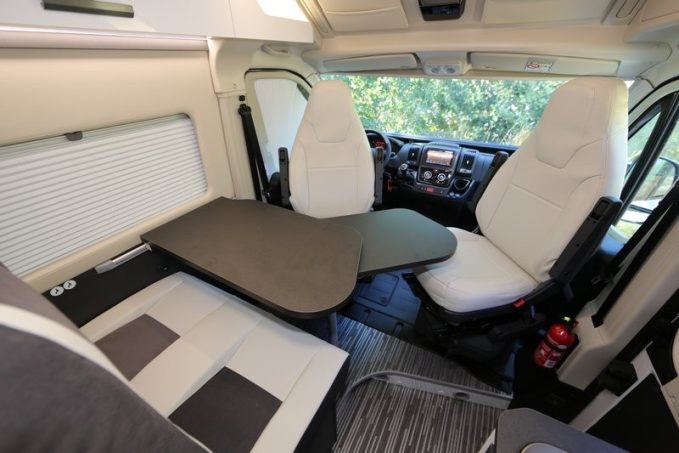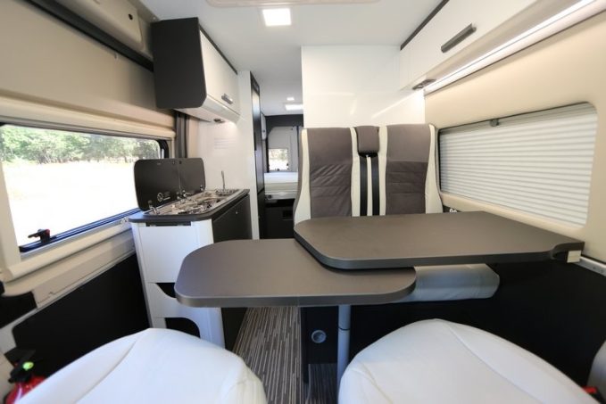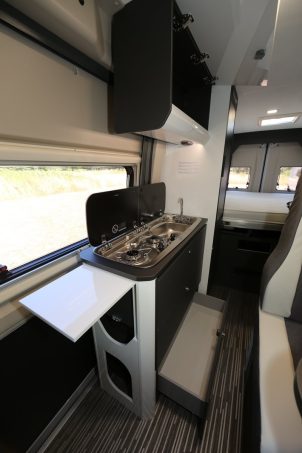 Le bloc-cuisine intègre un évier et un réchaud deux feux ainsi qu’un plan de travail escamotable. Trois tiroirs facilitent le rangement de la vaisselle et des denrées. Placé au-dessus de la penderie, le réfrigérateur Thetford (90 l) autorise un accès plus facile. Livrable en finition S-Line (comme notre version d’essai) ou Prestige, le Menfys Van 4 Maxi S-Line bénéficie d’une belle présentation et d’un équipement satisfaisant (bouclier avant peint, marchepied électrique, moustiquaire de porte latérale, chauffage à carburant). La cabine est aussi bien dotée : climatisation manuelle, régulateur de vitesse, vitres et rétros électriques, combiné autoradio couplé à une caméra de recul, store d’occultation pare-brise.