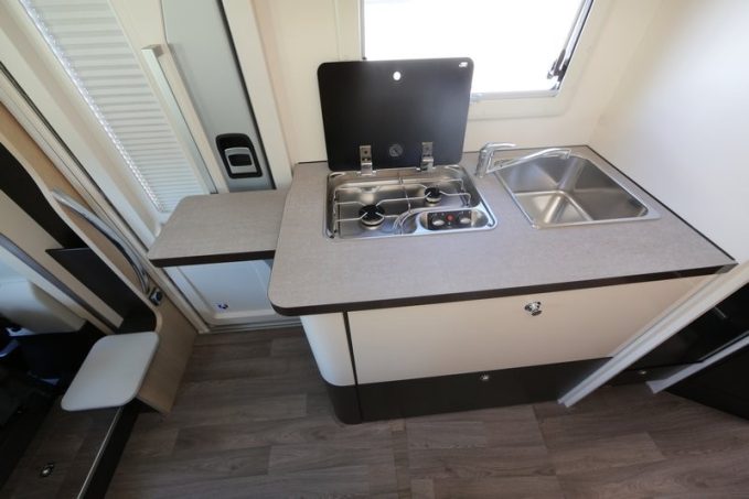 A propos du profilé Performance P680 LJ du constructeur Autostar, nous pourrions utiliser un slogan publicitaire bien connu qui déclarait qu’il a tout d’un grand. Et c’est vrai que ce compact très étroit (la cellule est de même largeur que celle de la cabine du Fiat Duacto) offre un intérieur spacieux et bien agencé. Côté jour, on se trouve dans un beau salon, mis en valeur par de jolis coloris, composé des sièges de cabine sur embase pivotante, d’une grande table avec rallonge tournant sur un axe, et d’une banquette face route. Un tabouret bas, situé sur la droite, peut éventuellement recevoir un jeune enfant. Cette partie est très lumineuse, grâce au large sky roof (ouvrant) intégré dans la casquette de profilage. Le bloc-cuisine est des plus classiques. Il occupe la partie latérale droite de la cellule. Il se prolonge rapidement à l’aide d’un plan de travail articulé, maintenu par une équerre pivotante. Les rangements sont assez nombreux et, surtout, efficaces. Le réfrigérateur est un modèle de 141 l avec compartiment conservateur indépendant.