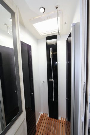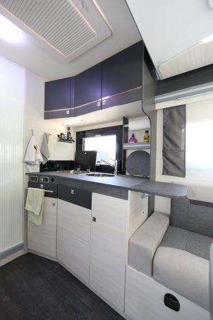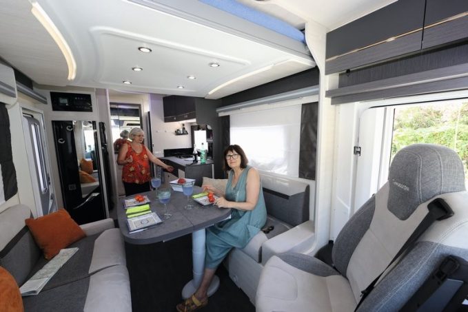 Les + : Standing du salon // Immense salle d’eau, très agréable à l’usage // Capacité de rangement importante (penderie, soute, garage…) // Gabarit intéressant du véhicule // Chemin lumineux au plancher pour la nuit // Super-revêtement de table du plan de travail.