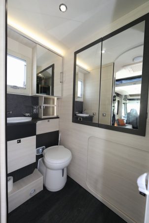 Pour ce qui est de l’aménagement, le 6040 n’est pas sans rappeler celui du profilé 640 puisqu’ils sont aménagés à l’identique. Un profilé qui est d’ailleurs leader des ventes en Europe ! A bord donc, pas de lit permanent. On a ainsi l’espace pour un très grand salon composé de banquettes latérales disposées en vis-à-vis. Au centre, un table rectangle et pliable de 100 x 82 cm. Dans le coin cuisine, on trouve, en plus du réchaud 2 feux, de l’évier rond et d’une rallonge du plan de travail, de nombreux rangements qui rendent cet espace pratique et complet. Situé juste en face du bloc-cuisine, le réfrigérateur à absorption fait 175 l. Pour ce qui est de la partie arrière du véhicule, elle est occupée par une large salle d’eau. D’un côté, une cabine de douche vraiment spacieuse et de l’autre, un WC et un lavabo. Enfin, au fond du véhicule, on trouve un très grand espace de rangements, accessible par deux portes. S’y cache une penderie, de nombreuses étagères et 4 tiroirs. Une belle réussite bien qu’on y regrette le manque d’éclairage.