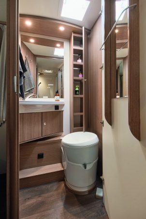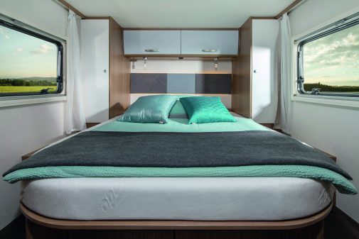 En ce qui concerne la chambre, ce T459 reprend à l’identique celle maîtrisée et éprouvée du T449. On retrouve donc naturellement un grand et confortable lit central sur soute. Le matelas affiche des cotes honorables de 150 x 195 cm. Comme sur l’ensemble de la série, Carado propose en option un couchage en pavillon. Logé au-dessus du salon face-face, il reste manuel avec des dimensions de 140 x 190 et un biseau en pied. Il faudra tout de même débourser 1485 € supplémentaires au tarif de base de ce T459.