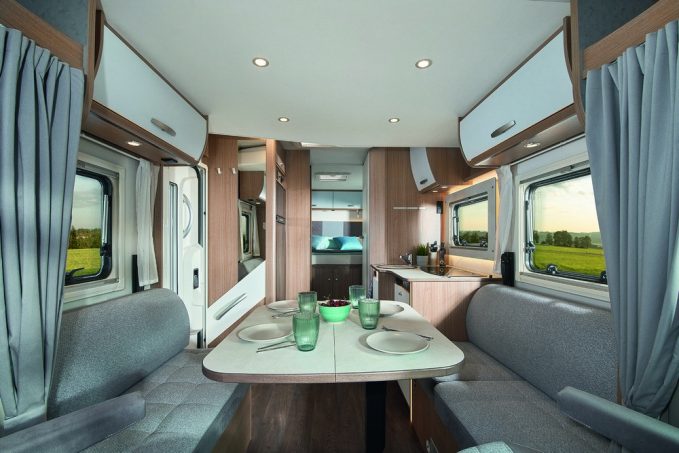Cette saison est marquée par le lancement sur certains profilés d’une édition dite Clever et Clever+. Ce T459 est éligible à ce pack et le modèle à l’essai se présente sous la forme la plus richement dotée, à savoir la seconde. Avec son tarif de 53 900 € (soit 5150 € de plus que le modèle de base affichant un tarif de 48 750 €), ce véhicule reçoit en premier lieu la motorisation de 140 ch et les jantes 16". Pour mettre les petits plats dans les grands, Carado a décidé également d’y intégrer les packs Châssis, Dynamic et Confort, le grand frigo, les stores plissés en cabine, les baies à cadre affleurantes, le skyroof, le store extérieur ainsi que, pour le confort des usagers, une TV 22" avec une antenne satellite incluse.