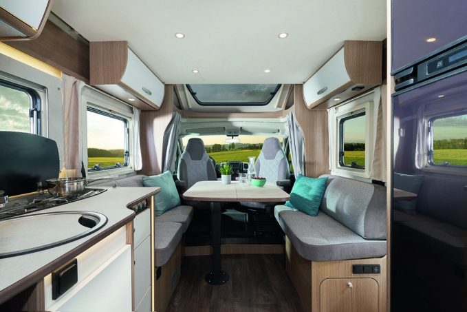 De prime abord, ce T459 affiche une longueur de 7,40 m commune à d’autres modèles du catalogue. Pourtant, ce véhicule se distingue très nettement de ses frères dans son habitacle par le fait d’être l’unique agencement axé sur un salon avec banquettes en vis-à-vis. Le coin repas profite donc d’une grande aération et la circulation sur l’avant n’en est que facilitée. Sous les assises, se trouvent des dossiers rabattables qui avec les coussins permettent de confectionner des places homologuées route positionnées dans le sens de la marche.
