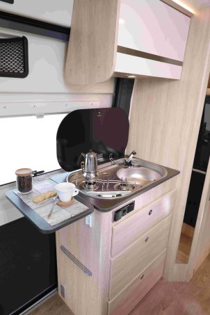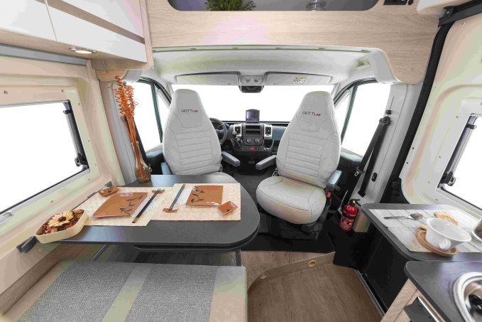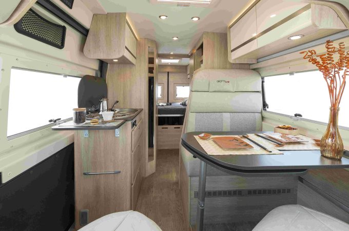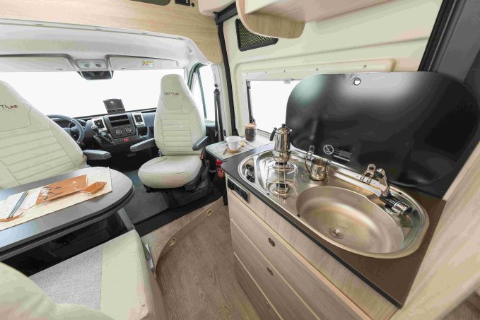 Les habitués des fourgons du groupe Rapido seront en terrain connu avec le Van 60T de GiottiLine. Et pour cause : la marque italienne a été rachetée il y a 4 ans. Elle bénéficie donc ici d’une implantation qui a fait ses preuves avec le Dreamer D55. Le Van 60T adopte donc, lui aussi, un salon 4 places composé des sièges cabine pivotants, d’une table centrale à rallonge et d’une banquette face route. Le bloc-cuisine est équipé de rangements, d’un réchaud 2 feux et d’un évier et, dans la diagonale, d’un réfrigérateur de 135 l. Juste à côté de ce dernier, on trouve la cabine de douche. Elle fait face au cabinet de toilette et son lavabo. Un aménagement rendu possible grâce à l’intégration de la penderie dans la cabine de douche -que vous avez déjà pu voir chez Campérêve.