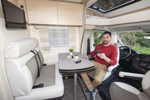 Pour ce P690LC, Autostar exploite une partie de l’implantation du P680 LJ. La zone jour, notamment est identique dans les deux modèles. Le coin repas se compose d’une banquette face route pour deux personnes et des sièges de cabine pivotant. Dans l’entrée, un strapontin peut servir d’assise complémentaire pour une cinquième personne. Mais ce petit siège servira sans doute plus de repose-pieds.