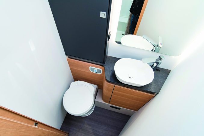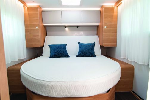 Ce Matrix Axess profite en effet d’un confortable lit double électrique de pavillon de 130 x 200 cm. Si la manipulation reste simple, il faut toutefois faire preuve d'un peu de patience pour l’abaisser et le relever, le système de câble se révélant beaucoup trop long. En partie arrière, l’appellation DC laisse entendre qu’il s’agit ici d’un lit central. Ses dimensions sont bonnes avec 150 x 195 cm et le couchage est pourvu d’un sommier à tête relevable, comme il est conseillé de relever l’ensemble pour circuler aisément autour du lit. Cet espace s’accompagne d’une salle d’eau en deux parties pouvant, si besoin, être réunies en un seul compartiment.