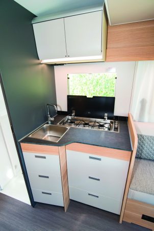 Sur le plan équipements/confort, Adria reste fidèle à la philosophie d’entrée de gamme Axess : ce 650 DC est proposé exclusivement sur le châssis Citroën Jumper. En revanche, la marque a souhaité intégrer d’origine la motorisation de 140 ch ainsi que des suspensions pneumatiques sur les roues arrière pour un meilleur confort routier. Le Matrix 650 DC est commercialisé à 59 950 € et n’est d’ailleurs disponible que dans cette seule version Axess. Adria n’a en effet pas souhaité décliner cette implantation sur 7,29 m en Plus et Suprême.