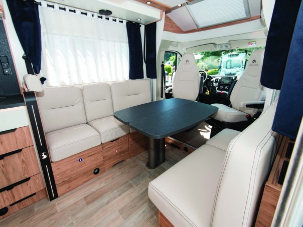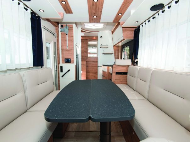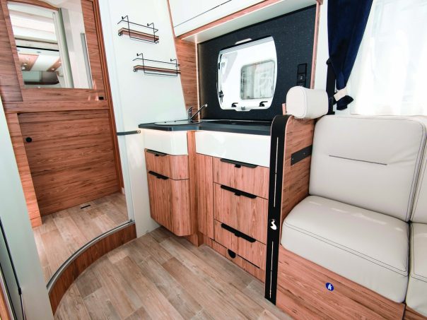 A l’étape, les occupants de ce profilé de 6,99 m profiteront d’un lit de pavillon de 155 x 200 cm qui s’abaisse, au plus bas, à presque 70 cm du sol. Animé par un moteur électrique, il est possible de sélectionner la hauteur souhaitée et de permettre la transformation de la dînette en couchage. La salle d’eau, logée en bout arrière, occupe toute la largeur de la cellule.