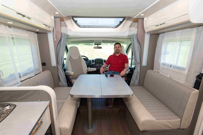 Sur ce modèle, l’implantation permet de profiter d’une salle d’eau avec douche séparée – que l’on peut, au besoin, raccorder à l’aide de la porte de cuisine et de chambre. Le sky roof monté d’origine sur la casquette avant, avec le pack Soleil, apporte un maximum de luminosité dans le coin dînette. La dotation de série comprend en plus un puissant combiné de chauffage (6 000 W). Dommage que le second portillon de soute, toujours utile, et la motorisation de 140 ch, nécessite une rallonge de respectivement 362 et 957 €.