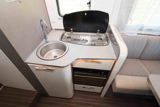 Finition à l’allemande et présentation à l’italienne, le profilé T7400 cumule ses deux atouts avec en plus un prix serré. Contrairement à la version SB (salon à banquette en L), celui de la SBC dispose d’encore plus d’espace avec deux banquettes en face-à-face, pour s’y retrouver jusqu’à six convives. Sa table, avec pied décentré et plateau repliable en deux, se montre plutôt pratique à l’usage. Pour une ambiance intérieure plus chaleureuse, il faut opter pour le pack Type X Design (1 199 €) avec une sellerie claire Emilia et des façades de mobilier blanc/crème brillant. A bord, les rangements ne manquent pas (placards en pavillon et penderies en pied de lits). Le meuble de cuisine se montre cependant d’un format réduit. Le réfrigérateur “slim” qui lui fait face affiche une bonne contenance (167 l).