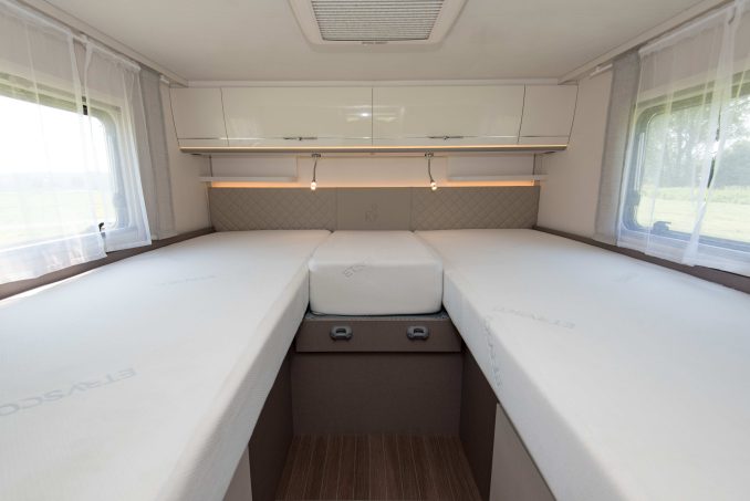 En chambre, la présence de lits jumeaux (81 x 205 cm) exige un véhicule avec un porte-à-faux arrière plus important. En contrepartie, leur accès par le centre se montre plus aisé, sans pour autant pénaliser le volume de la soute, située en dessous. La marque a également prévu une extension de sommier coulissante qui permet de raccorder les deux matelas. Avec une mousse d’appoint, placée au centre, le confort devient royal. Pour envisager de dormir à quatre à bord, un lit de pavillon (132 x 192 cm), fixé au-dessus du salon, est disponible, mais uniquement sur demande. Facturé 1 481 €, il se met en place manuellement et nécessite la présence d’une échelle. Son tirant d’air est de 60 cm.