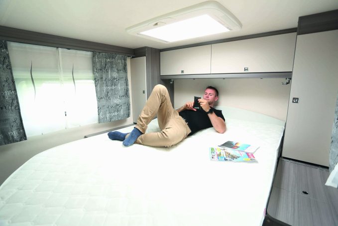 La chambre est étonnamment grande. On y trouve un vaste lit central (140 x 200 cm). En poussant le sommier au pied, on relève la tête de lit. Cette manipulation simple facilite les déplacements vers le couchage. Un couchage de dînette pour deux est disponible en option. La salle d’eau n’est pas très grande, mais elle demeure exploitable et agréable à l’usage. Elle recèle tout ce que l’on attend dans une salle d’eau : lavabo, WC, cabine de douche et rangements.