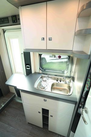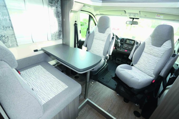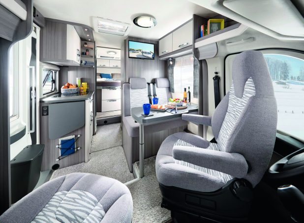 Le Van Optima Ontour Edition V65 GQ est un modèle compact. Comprenez que sa cellule est aussi étroite que la cabine du porteur. Malgré cette compacité, on met en avant le confort intérieur absolument remarquable. Les occupants disposent ainsi d’une agréable dînette formée d’une banquette face route et des sièges de cabine réversibles. Ce living baigne dans une grande clarté apportée par le sky roof. Le bloc-cuisine est muni d’astuces en tout genre qui permettent de gagner en rangement et en surface de travail (rallonge articulée). Le réfrigérateur est un modèle étroit slim Tower de 133 l à sélection automatique d’énergie.
