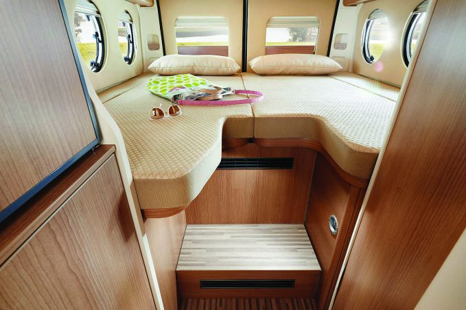 Aménagé sur la version la plus longue du Fiat Ducato, le 640 LE offre un espace nuit agréable en embarquant deux lits placés en long (189 cm côté salle d’eau et 203 cm côté cuisine). Ils sont en partie séparés aux pieds. Une marche, qui sert aussi de rangement, facilite l’accès aux confortables matelas. Les sommiers peuvent être relevés indépendamment afin de moduler la soute située en dessous. Quatre hublots latéraux et deux baies, sur les portes arrière battantes, baignent la chambre de lumière en journée. La marque a prévu, en option, un couchage d’appoint (une personne de taille moyenne) qui reste aménageable en dînette.