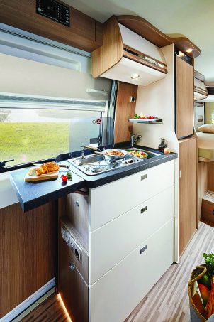 La table en dînette reçoit une rallonge rotative pratique pour y manger à quatre. Un plan de travail extensible est aussi prévu dans le prolongement du bloc-cuisine. Le dessous de la banquette passager peut servir de réserve alimentaire (tiroir latéral intégré) et le faux plancher sous la table permet d’y glisser des chaussures.