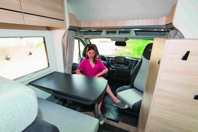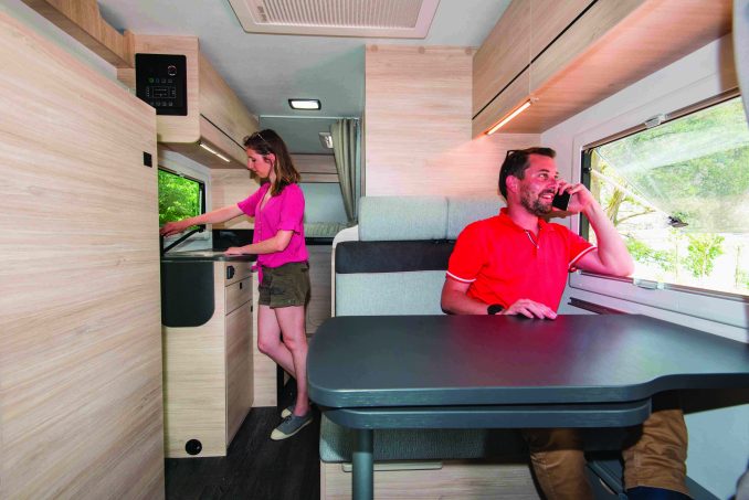 Le débat qui existe entre les pro-fourgons et les pro-profilés pourrait s’estomper avec le S194 de la nouvelle série S. Ce modèle est aussi bien compact en longueur (5,99 m) qu’en largeur (2,10 m). Le “S” signifie slim (étroit, en anglais), mais cela peut aussi exprimer “surprenant” dans l’approche et l’implantation. Comme indiqué dans la présentation, ce véhicule est hors norme, combinant la ligne (plus ou moins réussie) d’un profilé et l’agencement de fourgon. La porte cellule est classique. Le salon est formé d’une banquette face route pour deux personnes, des sièges de la cabine pivotants et d’un plateau de table avec rallonge pivotante. Une penderie a été installée derrière le siège passager pour offrir un important rangement dès l’entrée.