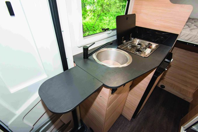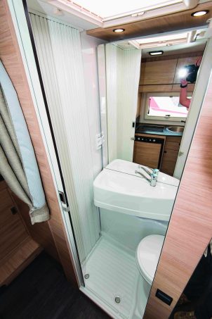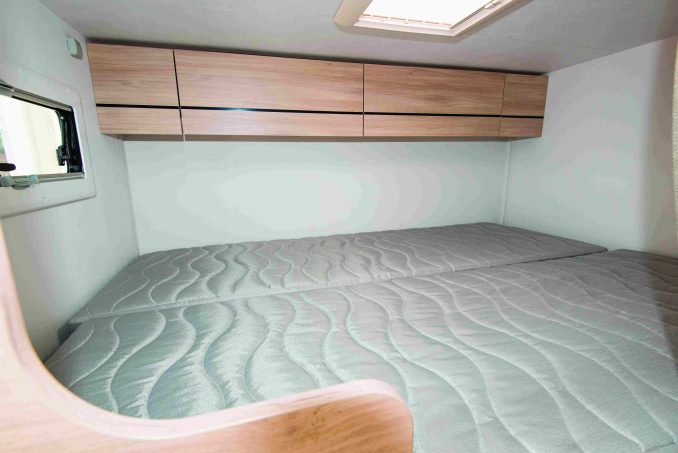 Dans la chambre, on trouve un lit transversal contre la paroi (des portes dans un fourgon). Le couchage est constitué d’un sommier dit “papillon” : il se relève par moitié dans la largeur, libérant de la place en soute. Celle-ci est accessible par des portillons extérieurs et une trappe intérieure. Deux placards de pavillon complètent la capacité de rangement. La salle d’eau est modulable avec une paroi mobile. Ainsi, la cloison – avec lavabo/miroir – pivote au-dessus des WC et dévoile alors une cabine de douche isolée et de dimensions correctes.