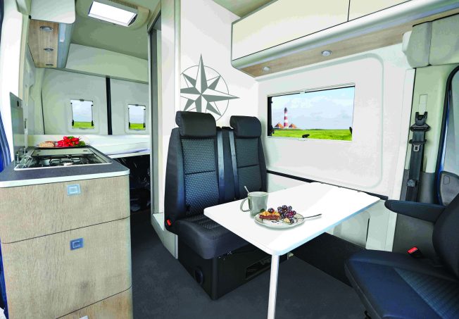 Apparu en 2020 comme “étude de style” sous l’appellation Big Nugget, le Ford Transit L3H3 entre au catalogue Westfalia sous le nom de Meridian, et en série limitée uniquement. Il conserve les mêmes caractéristiques : un plan assez classique, comprenant un salon à l’avant – capable d’accueillir quatre convives –, un cabinet de toilette “3-en-1” au centre et faisant face au bloc-cuisine, et une chambre à l’arrière avec des placards de pavillon. L’ambiance se veut moins clinique avec l’intégration de quelques touches de bois aux côtés des placards blancs. La banquette passager offre un confort digne de vrais sièges individuels.