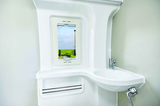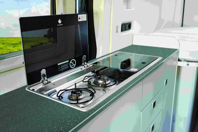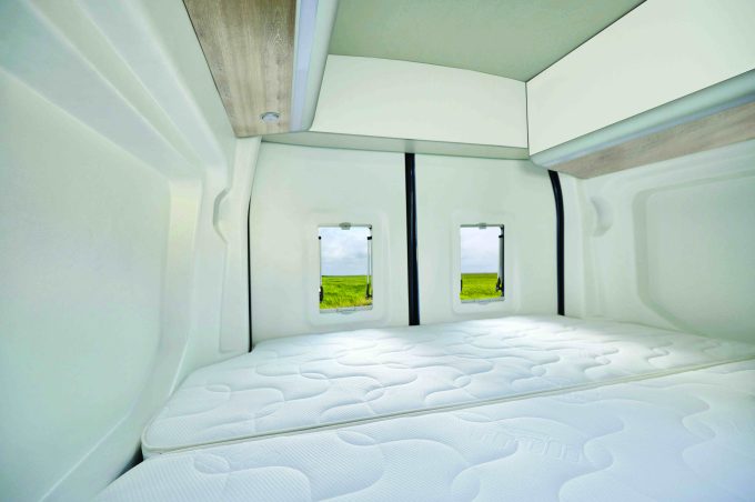 Pour offrir un maximum de confort aux usagers et permettre le montage d’un lit permanent de belles dimensions (200 x 154/131 cm), Westfalia greffe de petites extensions arrière à la carrosserie, à hauteur des baies avant. Contrairement au Sven Hedin, celles-ci sont fixes. Le sommier se relève au besoin, pour moduler le volume de la soute. Aucun couchage d’appoint n’est prévu dans l’espace dînette permettant d’accueillir une 3e personne pour la nuit.
