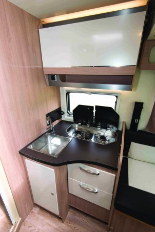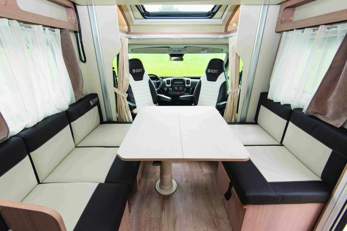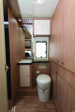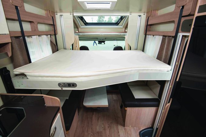 Le salon est surmonté d’un lit en pavillon électrique (149 x 192 cm), biseauté au pied – réduisant alors la largeur du matelas à 125 cm. La dînette est convertible en couchage double autorisant un usage à 4. L’arrière est totalement occupé par la salle d’eau (douche spacieuse, WC et lavabo) et le dressing qui comporte divers rangements compartimentés.