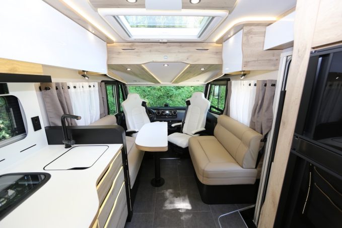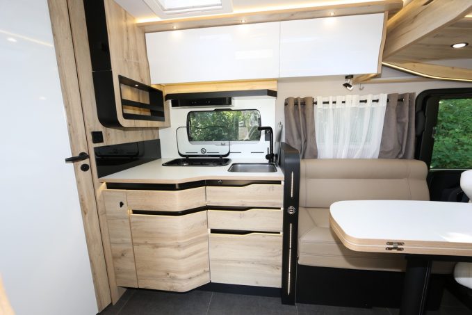 Au sein de la gamme Héritage, le 7.9 est le plus court. Il mesure toutefois près de 8 m de long, un gabarit qui autorise un aménagement très agréable. Les occupants disposent d’un maxi-salon avec banquettes latérales en vis-à-vis, encadrant une vaste table dont le plateau se plie en son milieu. L’ambiance est chaleureuse grâce au mobilier veiné, lequel apporte beaucoup de caractère à l’intérieur.