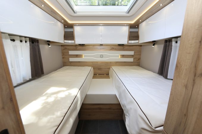 Le modèle présenté ici est pourvu de lits jumeaux (200 x 80 cm). Ces couchages sont de bonnes dimensions. Ils peuvent être réunis grâce à l’ajout d’un coussin central pour créer un lit king size. Le Voyageur propose également un modèle à lit central : le 7.9 CF. Dans les deux cas, l’habitacle reçoit aussi un lit de pavillon (190 x 140 cm) pour deux personnes. En option, ce couchage de cabine peut recevoir des rallonges pour en augmenter la surface.