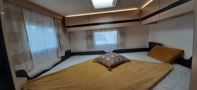 Pour conserver une telle brièveté à ce profilé, Autostar a doté la chambre d’un lit transversal. C’est la seule cellule du catalogue de la marque bretonne à proposer un tel couchage. De larges baies apportent, ici aussi, de la luminosité à la pièce tandis que les placards hauts, disposés sur deux parois offrent un espace de rangement convaincant et, surtout, ils sont complétés d’une grande penderie adossée à la paroi de la salle d’eau. Placé haut pour préserver une belle soute, le lit est accessible par un petit escalier.
