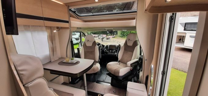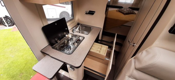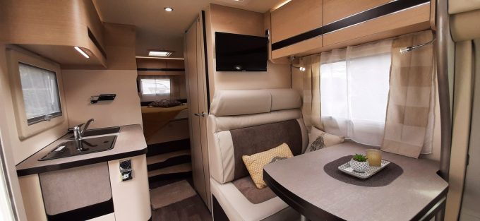 Ce profilé étroit (2,16 m) offre un intérieur bien agencé avec un beau salon s’articulant autour d’une grande table avec rallonge pivotante, d’une banquette face route et des sièges de cabine rotatifs. Un tabouret bas est situé entre la porte de cellule et le siège passager. Un large sky roof apporte de la luminosité à l’endroit. Le bloc-cuisine est des plus classiques et occupe la partie latérale droite de la cellule. Une extension de plan de travail permet de l’agrandir. Les rangements sont assez nombreux et le réfrigérateur affiche une contenance de 140 l.