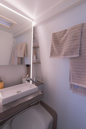Deux grands lits jumeaux particulièrement confortables assurent aux occupants de passer de très bonnes nuits à bord. En pleine journée, la chambre est baignée de lumière grâce à l’immense toit dôme. Cela vous donne aussi la possibilité d’admirer la voûte céleste, la nuit venue. Le cabinet de toilette n’est pas très spacieux, mais il est élégant et surtout très astucieux.