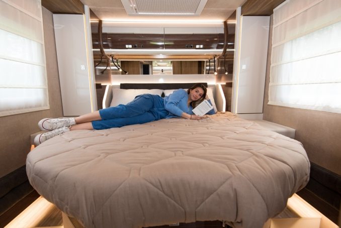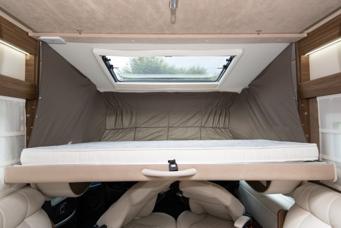 Cet intégral reçoit deux grands couchages bien séparés l’un de l’autre. En voyageant à deux seulement, on optera plutôt pour le lit permanent central à l’arrière de 150 x 195 cm. Pour faciliter la circulation dans la chambre, le lit est biseauté au pied et des deux côtés. Pour des vacances à quatre, on fera appel au lit de pavillon, facilement abaissable et également confortable.