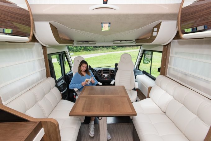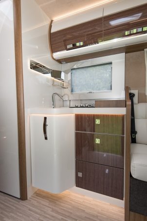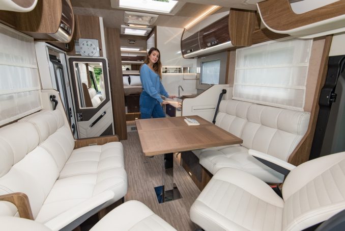 Le vaisseau amiral du constructeur italien en impose et attire le regard ! A la fois original et élégant, cet intégral marque son territoire. Même sensation une fois à bord, où l’ambiance type yacht (sellerie claire et bois sombre avec effet laqué) séduit d’emblée. La dînette, avec deux confortables banquettes face-face, une grande table rectangulaire et les deux sièges cabine, est un modèle de convivialité. Un bloc-cuisine en L, un “ensemble” cabine de douche d’un côté, cabinet de toilette et WC de l’autre, complètent la disposition intérieure.