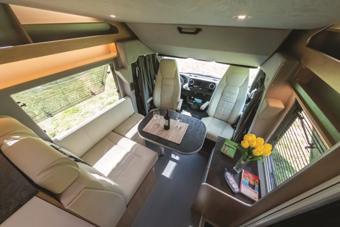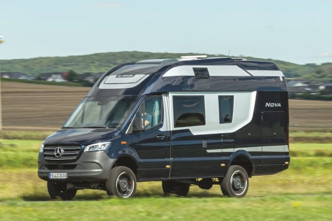 Le Nova représente ce qui se fait de mieux chez La Strada en matière de fabrication et de porteur. Ce profilé à cellule monocoque, sur Mercedes Sprinter, est livré d’origine en version propulsion. Comme notre version d’essai, il est possible de le commander avec quatre roues motrices, moyennant une rallonge de 14 747 €. En plus d’un look “aventurier” encore plus craquant, le véhicule ainsi équipé peut éventuellement sortir des sentiers battus. Son habitacle fait la part belle au luxe autant qu’à la praticité (sellerie cuir, rangements dans le plancher, grande soute à deux entrées, commande centralisée de tous les ouvrants, portillons parfaitement intégrés à la carrosserie).