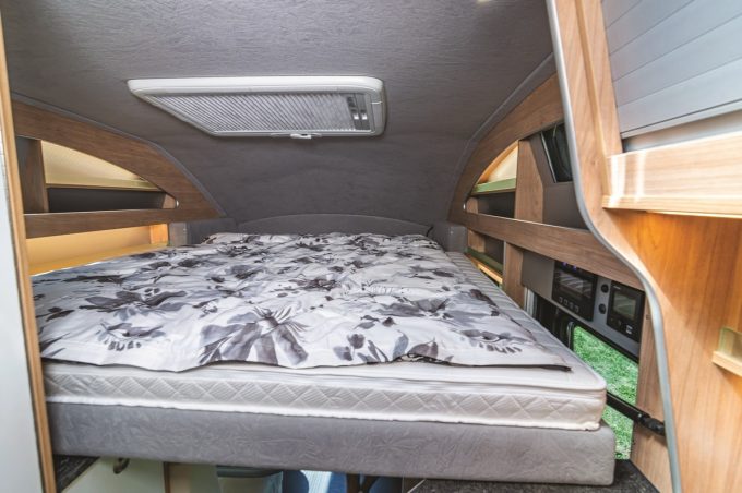En version M, le Nova ne dispose que d’un lit permanent pour une personne (97 x 205 cm). Il est placé en position transversale arrière juste au-dessus de la soute, accessible pas une trappe interne près du sommier. Le couchage le plus grand, pour deux, est dissimulé dans le pavillon avant. Il ne se montre pas gênant pour les grands en journée (de 178 à 192 cm de "hauteur sous plafond"), mais nécessite un peu de poigne pour l’actionner (absence de moteur électrique). Cela oblige aussi à grimper à l’échelle. Mais, une fois allongé, ses cotes généreuses (140 x 200 cm) s’avèrent appréciables… comme ses niches de rangements latérales.