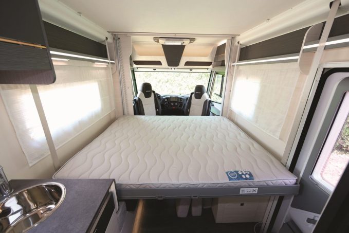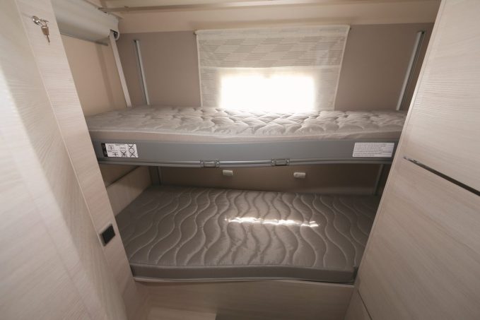 Même si c’est un intégral, ce véhicule est pourvu d’un lit de pavillon, logé au-dessus du salon. Un positionnement identique au 2060, commercialisé l’an passé, qui permet de profiter de rangements en cabine. A l’opposé, un véritable espace est dédié aux enfants. Ce modèle loge des lits superposés : le couchage supérieur se situe en pavillon et s’abaisse électriquement, alors que le sommier inférieur est fixe, mais réglable en hauteur manuellement. Vous l’aurez compris, cela permet de jouer sur le volume de la soute.