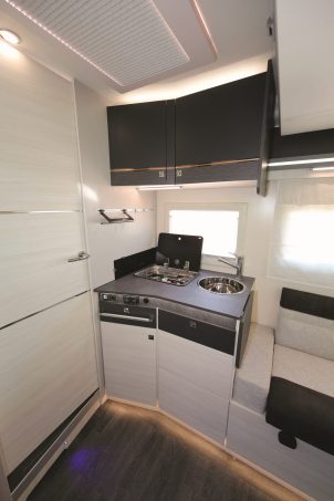 Comme l’an passé, Challenger continue de peaufiner son image sur le secteur de l’intégral au point d’étoffer sa gamme d’un modèle supplémentaire à destination des familles. Baptisée 3080, cette nouveauté 2022 de 7,17 m de long récupère le plan d’un profilé. Il reprend en effet le meilleur du 380, à commencer par le maxi-salon avec banquettes face-face et sièges pivotant de la cabine (qui plus est Aguti). Ce living peut accueillir jusqu’à 7 convives. A noter que cet intégral est homologué en 5 places carte grise puisque la banquette latérale dispose d’une assise supplémentaire dos à la route. Il est le seul modèle du marché à disposer de 3 places arrière avec un salon lounge.